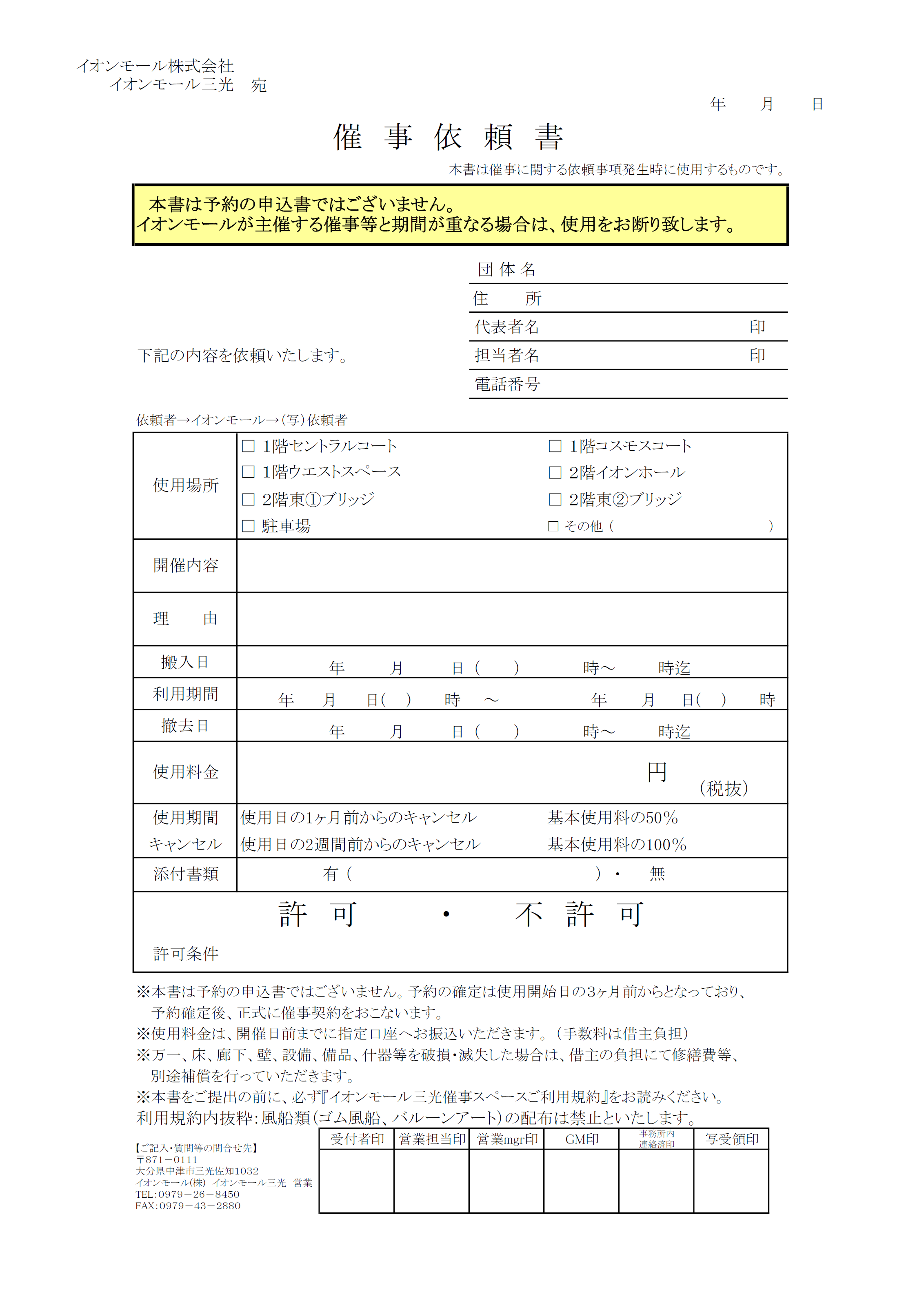 イオンモール三光のイベントスペースご利用をご検討いただき、誠にありがとうございます。